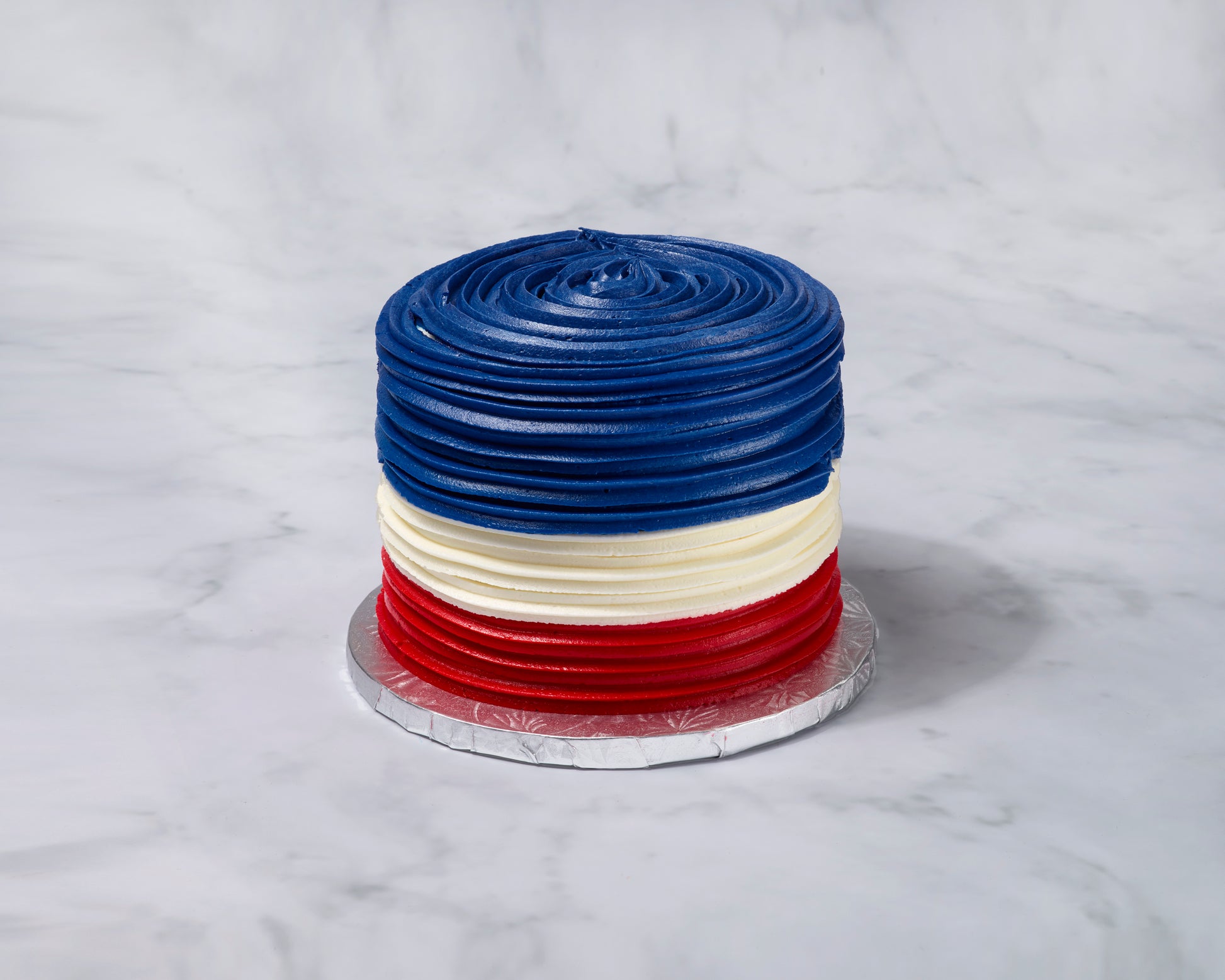 Our Captain America cake is frosted with buttercream stripes on the entire cake, in your choice of three colors. Write your message on the cake board. Comes in these flavors: